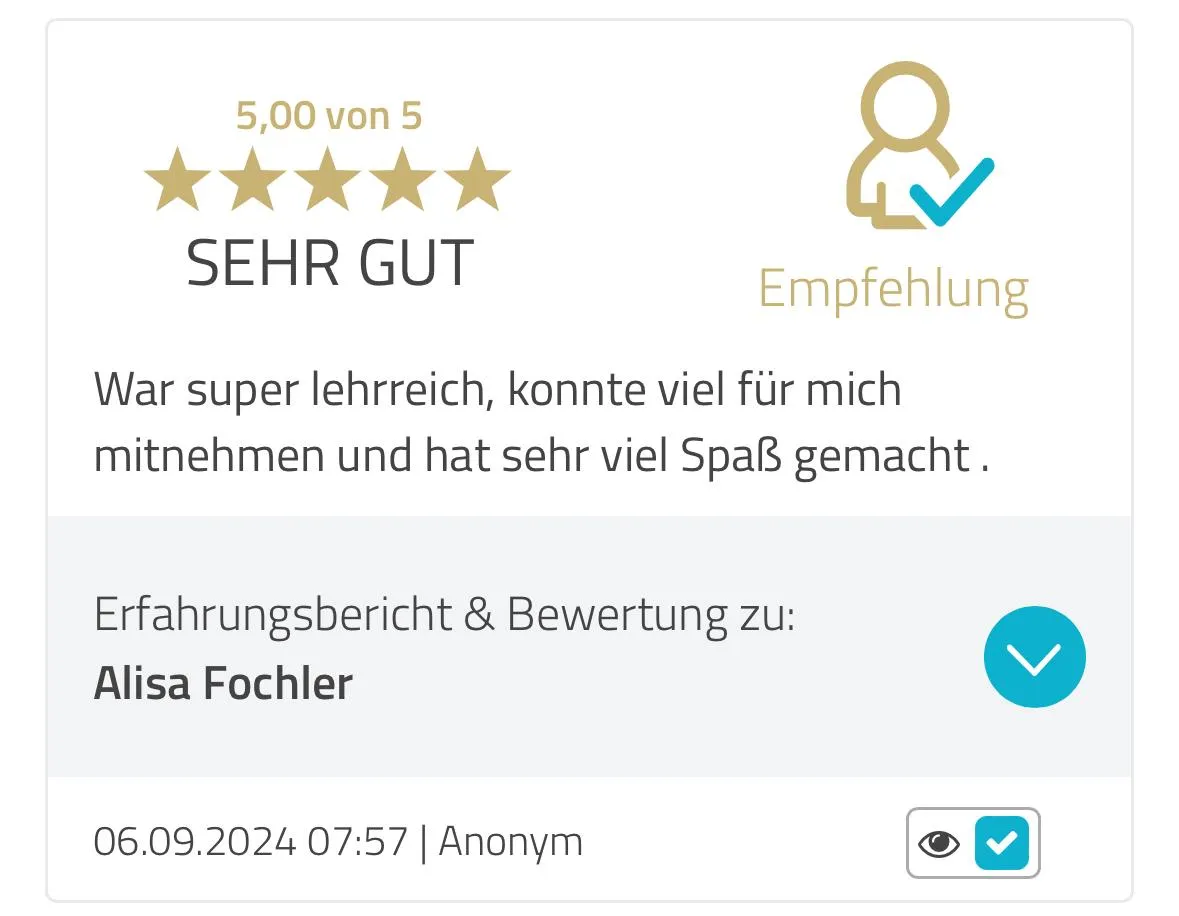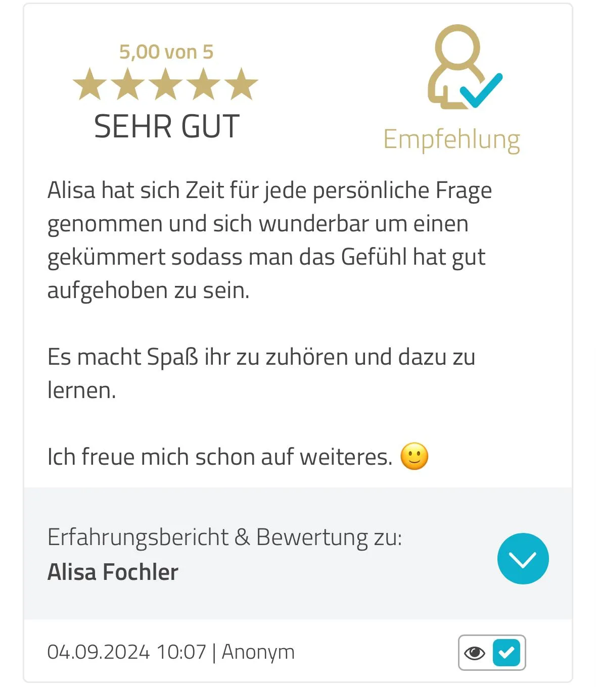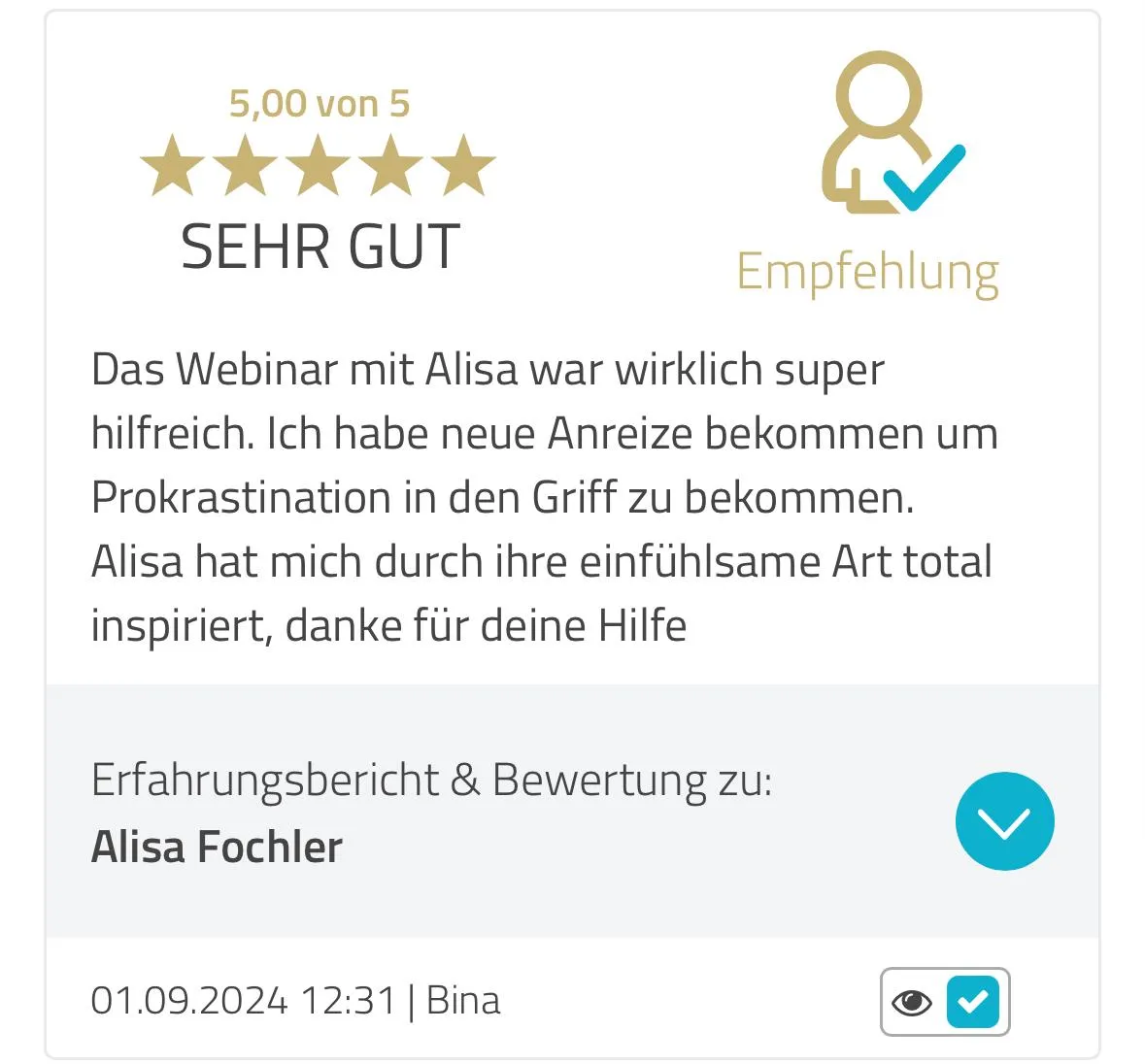 ⭐️⭐️⭐️⭐️⭐️ Alisa Fochler ist Gründerin von 2 Unternehmen, Master of Science, Diplom Stress- und Mentalcoach und arbeitet zusätzlich noch ehrenamtlich als Schwimmtrainern. Sie steht für Achtsame Produktivität als Schlüssel für ein nachhaltig erfolgreiches Business - ohne toxischen Leistungsdruck.
